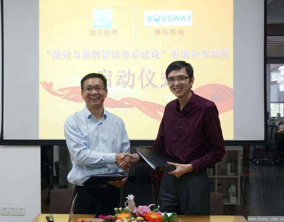 翔升總經理鄭君與博格總經理饒建輝共同簽訂項目合同,同時與翔升管理層一同簽署項目承諾書,共同承諾在項目期間全力以赴,貢獻智慧貢獻力量,保證項目的順利開展及成果。